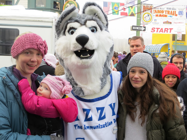 As a nod to all of that, children's vaccination has become a cause for which the race aims to raise awareness, primarily via bibs on some of the actual dogs and this Izzy The Immunization Dog mascot, which I assume to be a unlicensed offshoot of and/or apprentice to Izzy The Immunization Bear, which appears to be a California-based entity that posts on his blog even less frequently than I do.