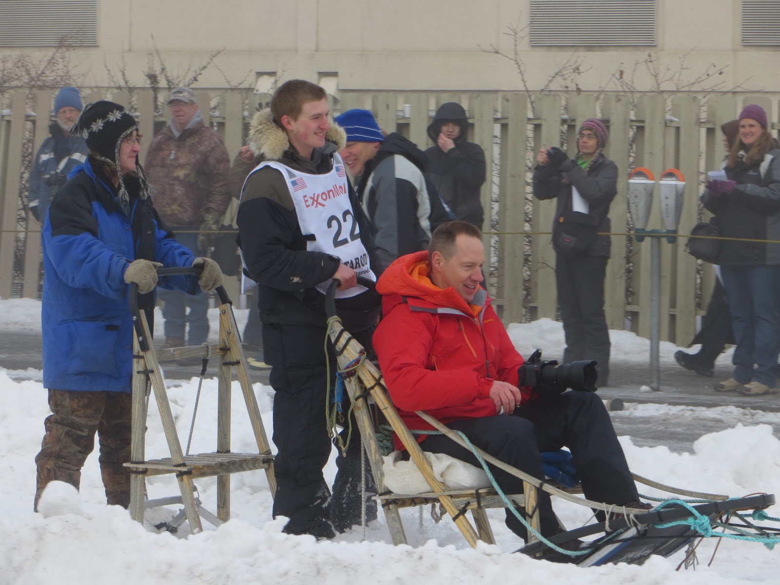 The downtown start requires a partial closure of 4th Avenue, an often-used but expendable-for-an-afternoon road lined with a lot of especially touristy places (mostly the sorts of gift shops where one can find "I Can See Russia From My House" refrigerator magnets and candy that is meant to resemble animal droppings). The traffic reroute is accompanied by the ironic task of trucking in thousands of cubic feet of snow - necessary for proper use of a sled, it turns out - and dumping it onto the street from which the same trucks have spent months removing it.