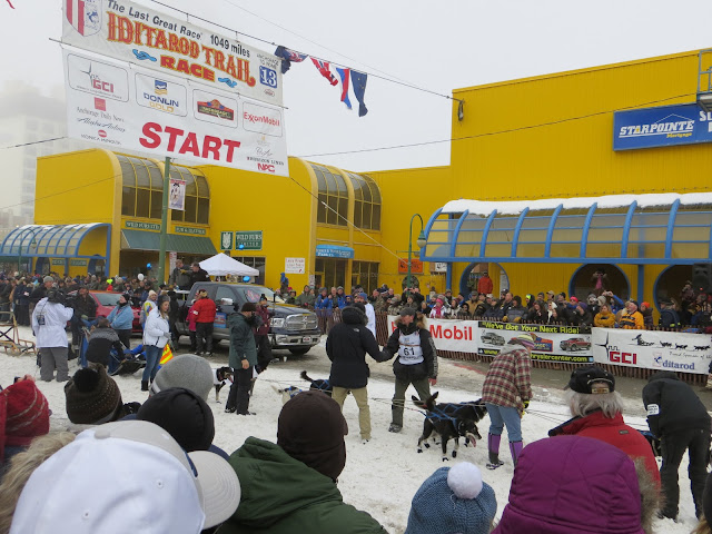 "Festivities" because a) this isn't really the start of it - the "restart" happens the next day in Willow, an hour-and-a-half drive north of Anchorage, at which point the stopwatches are actually clicked for the 987 mile trek to Nome, and b) the atmosphere is indeed quite festive. This first in-town leg is essentially the equivalent of an Olympic opening ceremonies, but about five hours shorter and with no creepy giant baby heads or whatever.