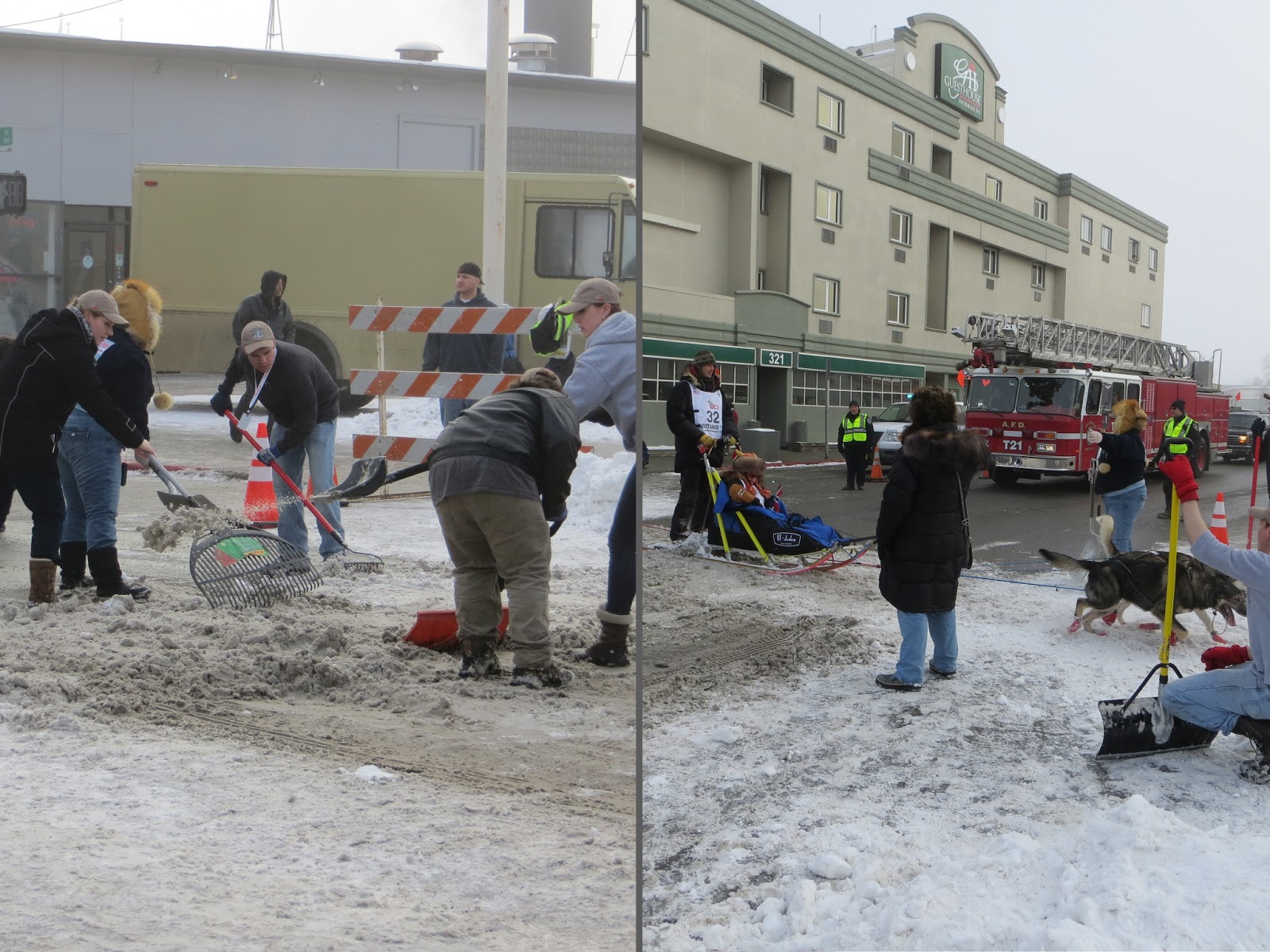 The course covers several blocks on 4th before turning south onto a secondary street and proceeding to cross 5th and 6th, two heavily-trafficked one-way roads comprising the primary east/west artery of the area. These stay open to traffic, but are blocked briefly to let each team cross. This means that a similar snow path is laid across them as well, but every time a group of cars and buses cross the path, the snow gets mashed and dispersed in ways that I gather to be non-optimal for sled runners. The chosen solution is that every time a musher is about to cross - every two minutes, for over two hours - a team of volunteers runs out to stop traffic and frantically shovel and rake a pile of dirty snow into something sled-passable. It is quite silly.